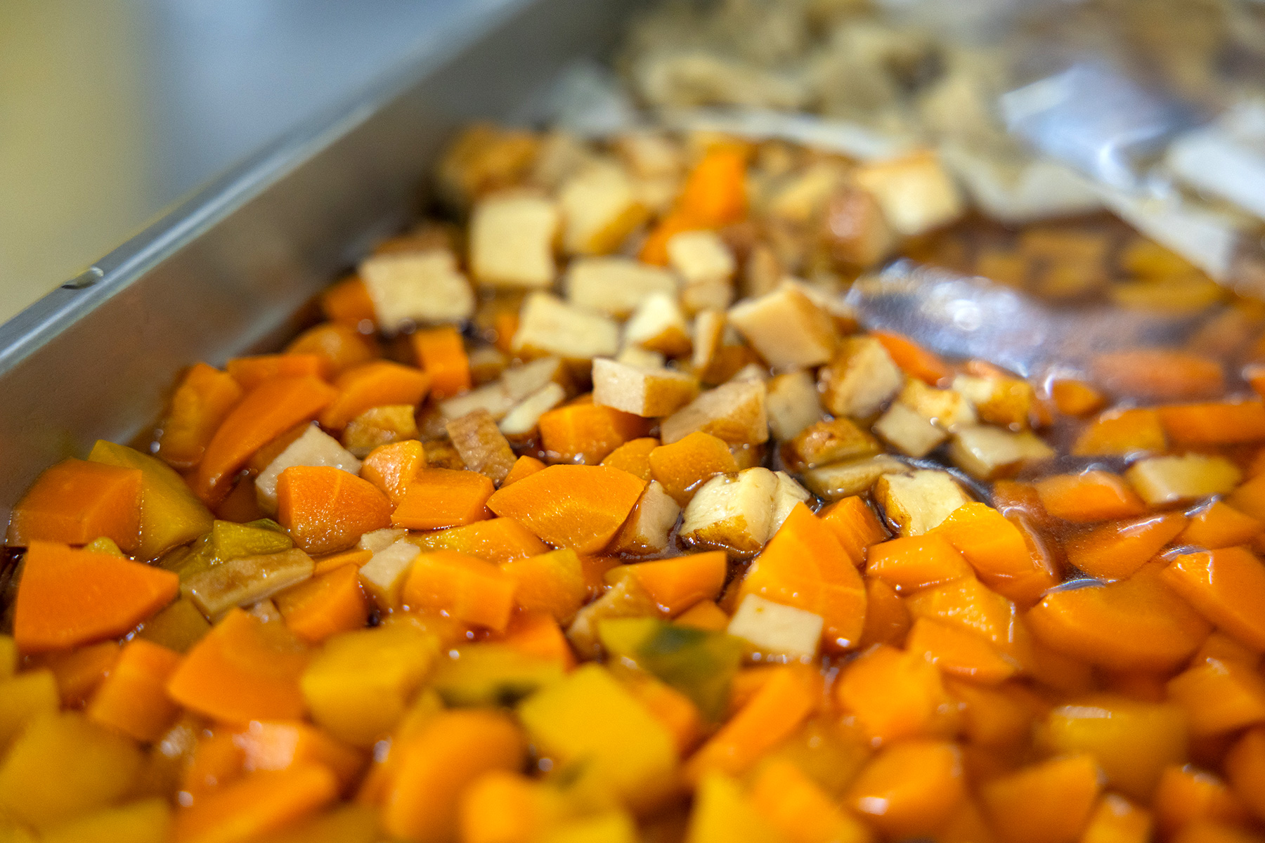 レイアウトを全面改装するとともに、調理機械を一新して、衛生管理の更なる強化の下、おいしい食事を特養・ショートステイ・デイサービスに提供しています。 なお、特養・ショートステイ部門の3つの多目的ホールに3台の温冷配膳車(温度を一定に保つ)で運び、温かい食事を提供しています。また行事食に加え、定期的に利用者様が選択できる食事を提供しています。